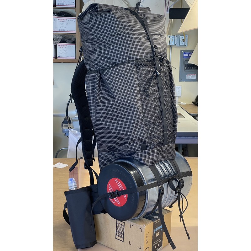One of a kind lightweight pack that hauls big bear canisters comfortably and conveniently in rugged terrain.