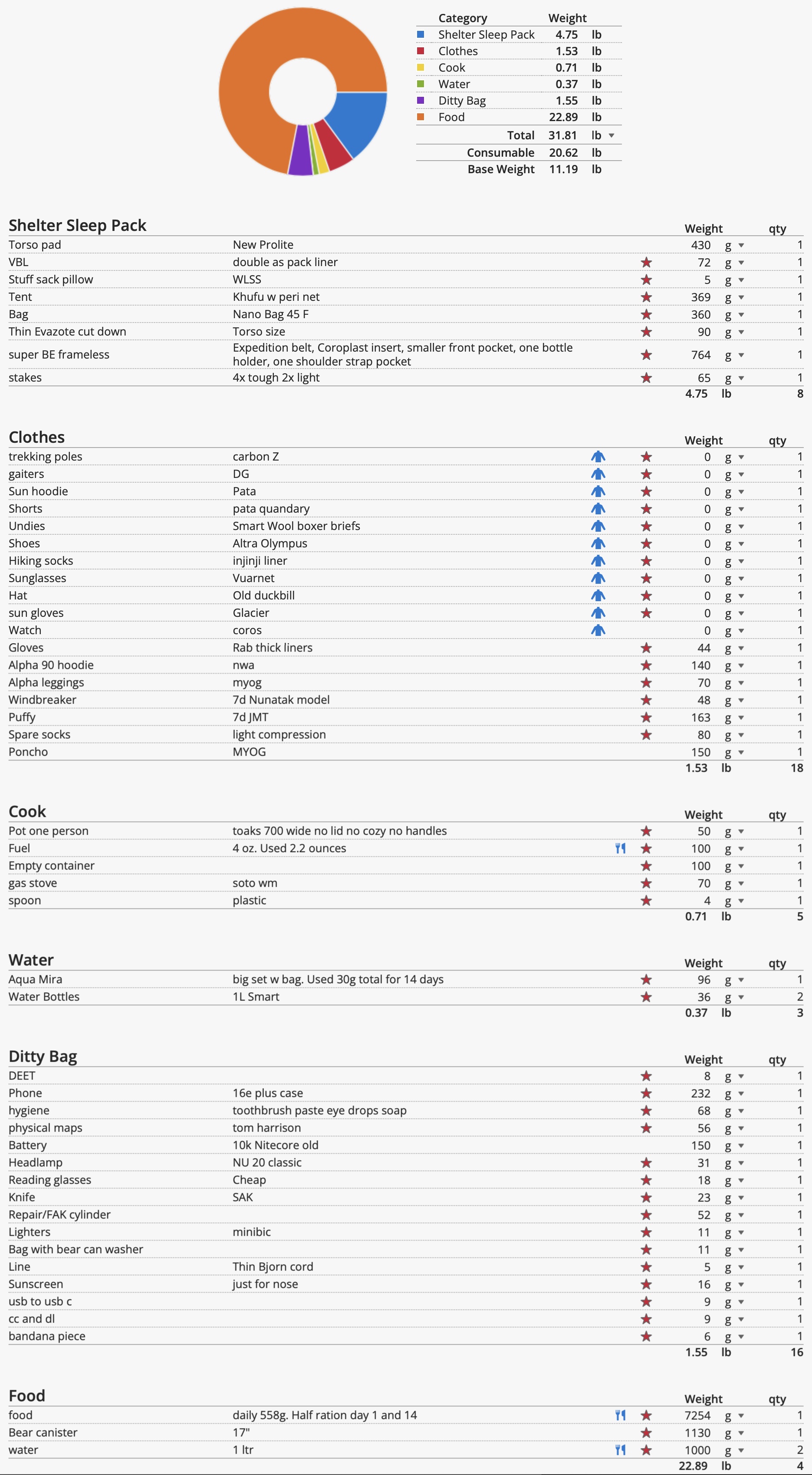 Recommended base weight for this pack is under 10 lbs, plus bear canister, plus water and food. Total pack weight should be kept under 35 lbs. With careful food planning I am able to start a two week trip with under 32 lbs TPW, see LighterPack below