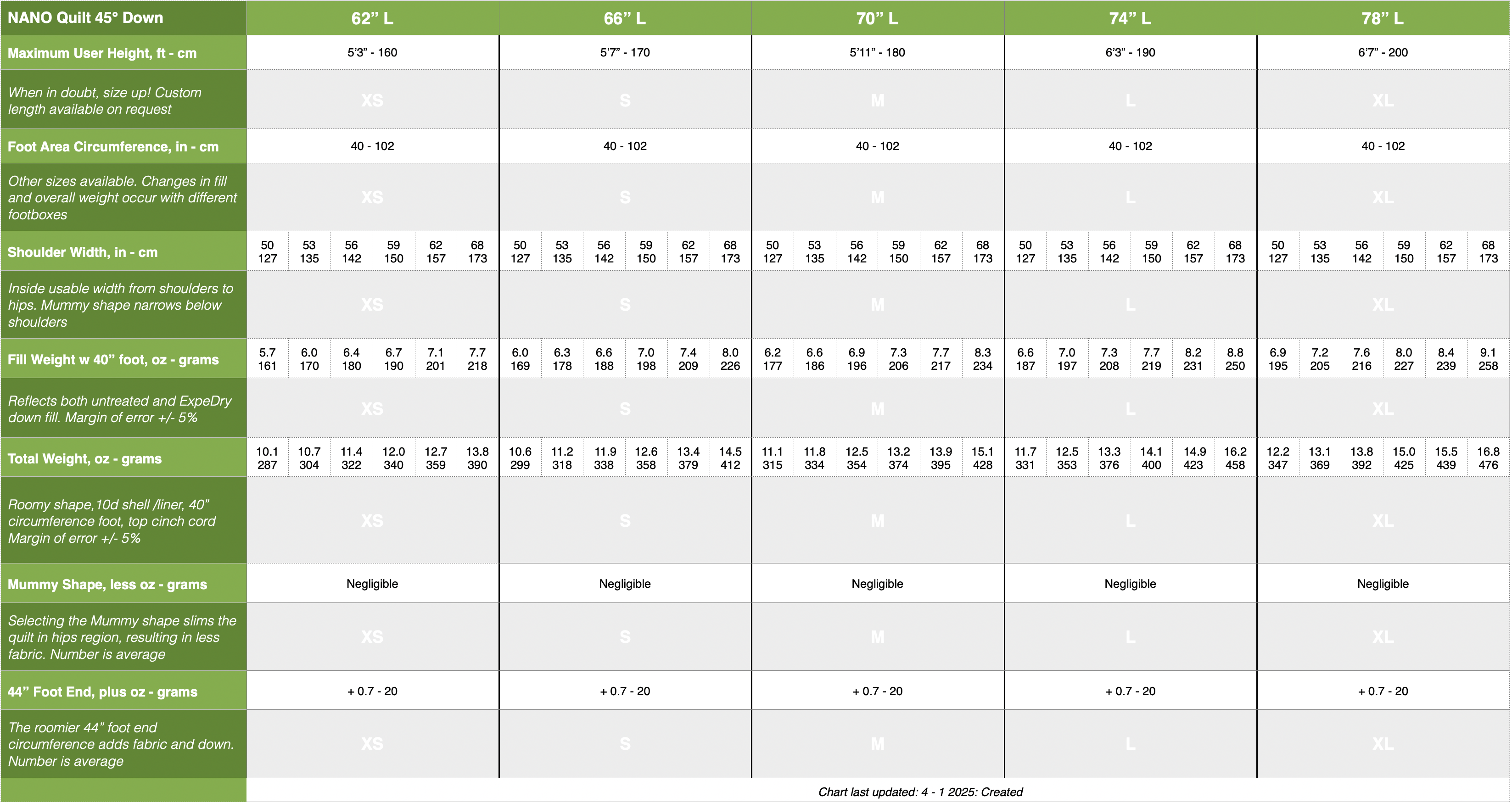 Width is the most important spec to get right. The Nano Quilt makes this easier with six real life options: 50" - 53” - 56” - 59” - 62” and the big guy: 68”. Most will be happy with the 56" width. Skinny folks, expert users and weigh weenies can go narrower. The restless, the big, and the dog co-sleepers can size up